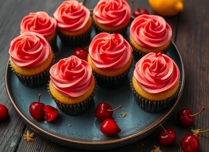 The vibrant colors of lemon cherry cupcakes create an eye-catching display that is hard to resist. Each cupcake is adorned with a generous swirl of creamy lemon cherry buttercream frosting, which not only adds a pop of color but also enhances the overall flavor profile.