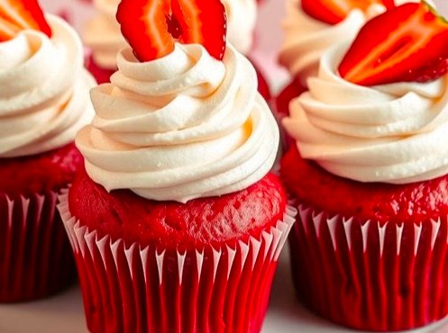 These cupcakes feature moist red velvet cake filled with a creamy strawberry filling and topped with whipped cream and fresh strawberries. The recipe yields about 12 cupcakes and takes approximately 1 hour to prepare and bake.