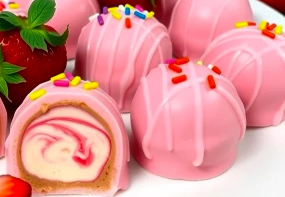 The pink chocolate coating adds a layer of sweetness and a smooth texture, perfectly complementing the tangy cheesecake filling. Each bite delivers a burst of strawberry flavor, making them irresistible to dessert lovers.