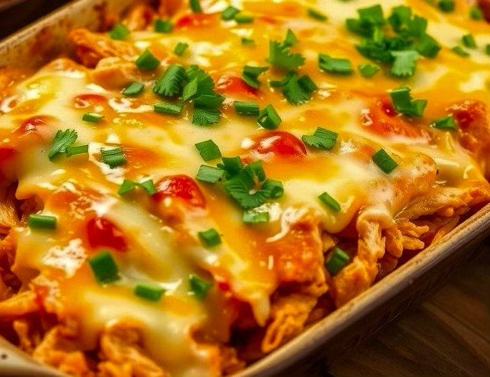 This casserole features shredded chicken layered with corn tortillas, a creamy sauce made from cream of chicken soup, tomatoes, and cheese. The dish takes about 1 hour from start to finish and serves 6 people.